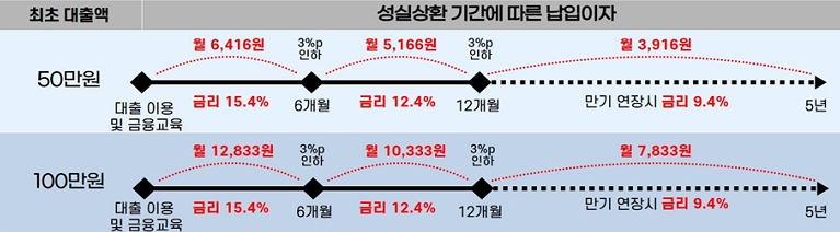 대출한도는 최대 100만원이며, 최초 50만원 대출 후 6개월 이상 이자를 성실히 납부하면 추가 대출이 가능하다. 연 15.45로 이자가 상당히 비싼 편임을 알 수 있으며, 성실하게 이자를 지급하면 6개월마다 3%포인트씩 인하되는 이자를 받을 수 있습니다.