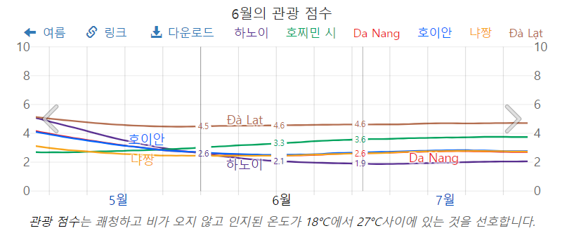 그렇다면 6월 베트남에서 여행하기 가장 좋은 곳은 어디일까요? 위의 차트에서 보듯이 달랏, 호치민, 호이안, 다낭, 나트랑, 하노이 순으로 여행하기에 적합한 것으로 나타났다.