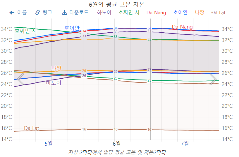 위는 베트남 주요 도시 중 하노이, 호치민시, 다낭, 호이안, 나트랑, 달랏의 6월 평균 기온을 보여주는 차트입니다. 아래 내용을 확인해주세요.