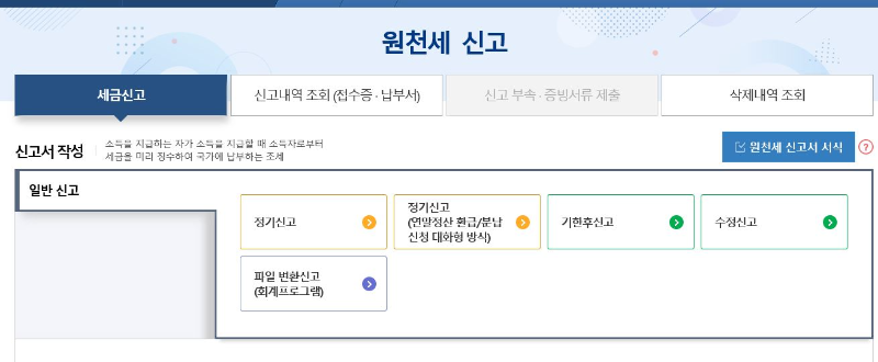 ㅇ 원천징수신고 메뉴 진입 시 정기신고, 지체신고, 수정신고, 파일변환신고가 있습니다.