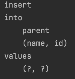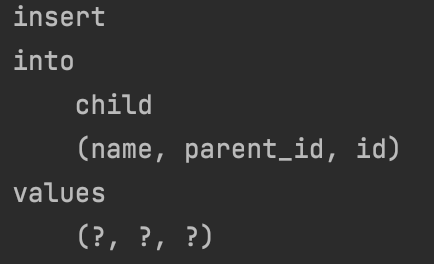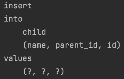 삽입 쿼리가 세 개의 부모, child1 및 child2를 반환하는 것을 볼 수 있습니다.